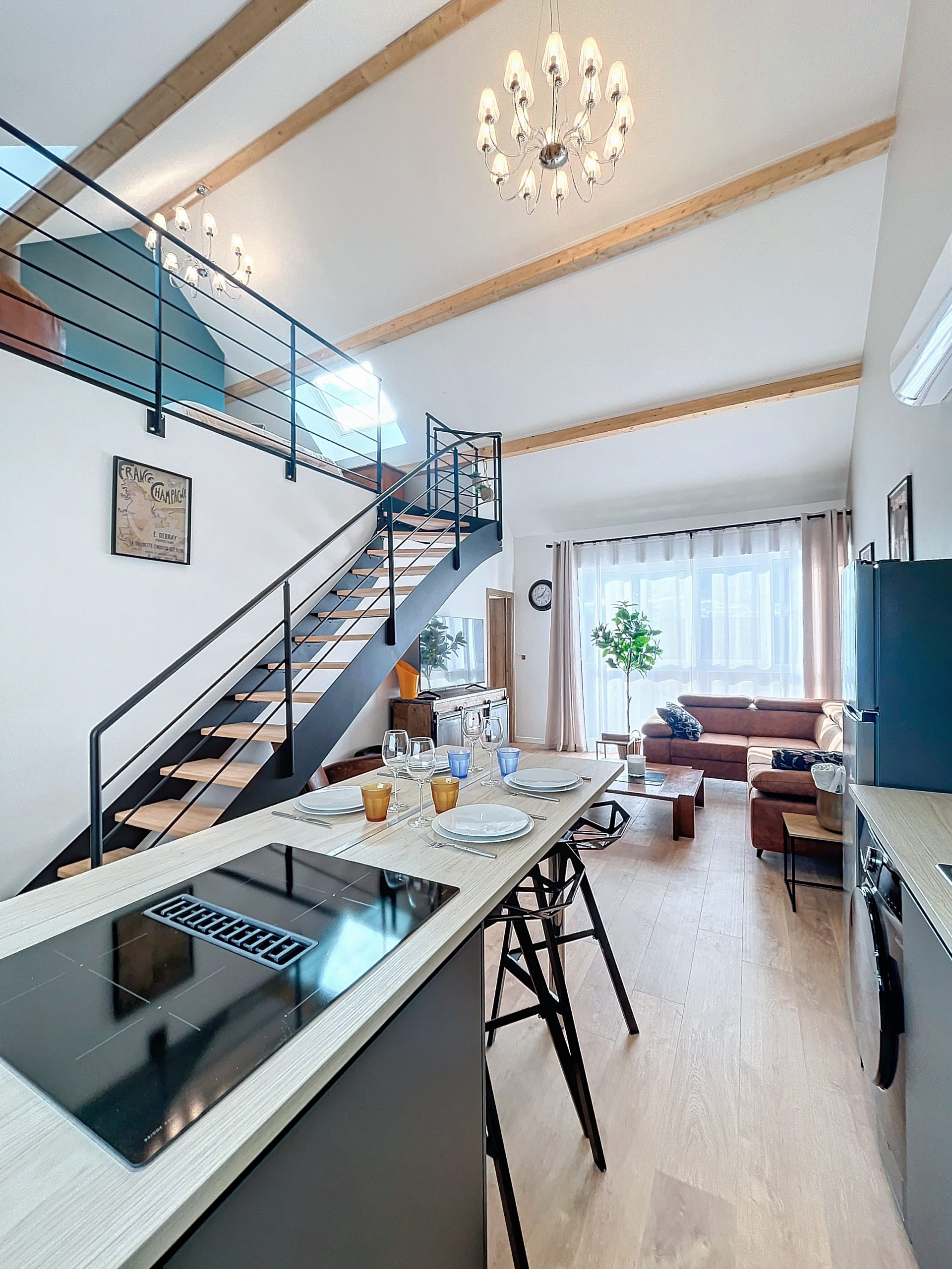 Un escalier décoré avec goût vous permettra d’accéder au premier niveau où vous retrouverez une cuisine entièrement équipée (four, plaques, hotte, réfrigérateur avec congélateur, micro-ondes, lave-vaisselle, lave linge, cafetière) ouverte sur pièce de vie lumineuse (comprenant un canapé convertible) avec vue sur le clocher de l’église du village.